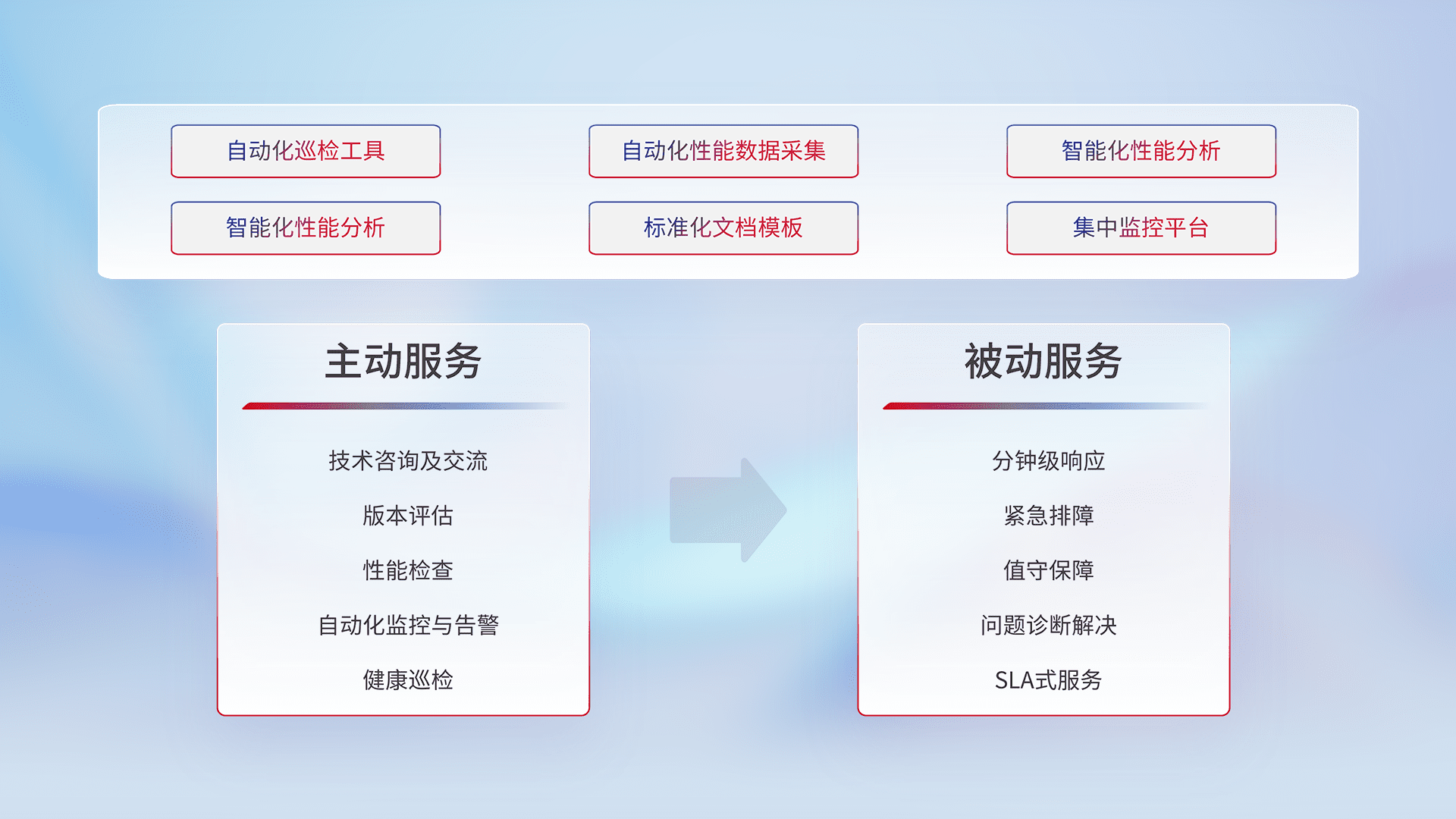 智能化工具和标准化文档,,保障服务质量,,提供主动服务(包含技术咨询、、、、版本评估、、、、性能检查、、、、自动化监控与告警、、、、健康巡检)和被动服务包含(分钟级响应、、紧急排障、、、值守保障、、问题诊断解决、、SLA服务)。。。。